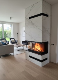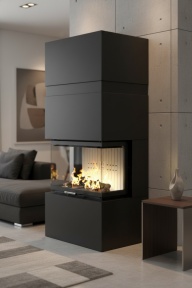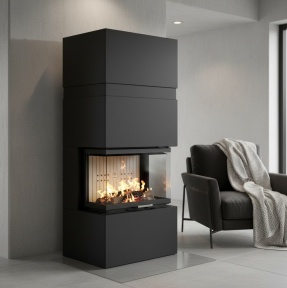 Svarīgi saprast – stūra kamīns apzīmē stiklojuma veidu, nevis obligātu uzstādīšanu telpas stūrī. Šos kamīnus bieži izmanto arī sienas nišās vai dizaina konstrukcijās.